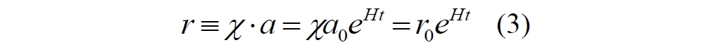 Строго говоря, масштабный фактор является довольно абстрактной величиной, размерность которой явно не просматривается, хотя производный от него параметр Хаббла определённо имеет размерность, обратную времени. Считая для определённости масштабный фактор безразмерным, придадим уравнению (2) принудительно вид современного закона Хаббла, с помощью дополнительного множителя χ, которому присвоим значение, например, 1 метр. Смысл этой манипуляции достаточно прост. Абстрактный масштабный фактор имеет смысл отношения пространственных интервалов в разные эпохи к некоторому исходному интервалу. Иными словами, этот параметр – масштабный фактор – относится ко всей Вселенной целиком. Поскольку сопоставляемые интервалы явно не обозначены, то об их размерности говорить вряд ли уместно. Но эти отношения абстрактных "масштабных интервалов" можно перевести в реальные физические отрезки, имеющие реальную размерность – метры, километры, например, используя переводной множитель – χ.
