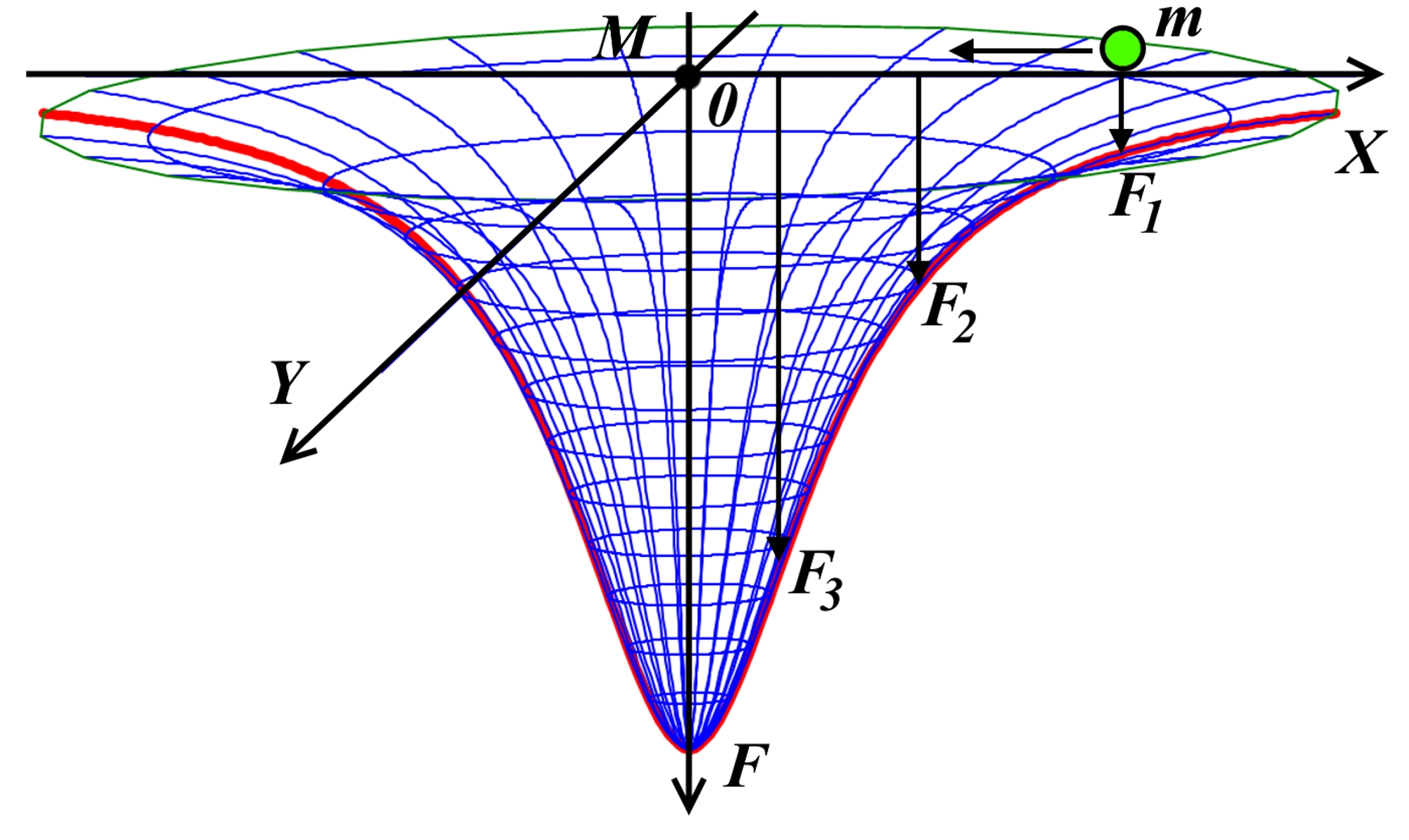 Притягиваемое, малое пробное тело m, физически может перемещаться только в плоскости X0Y. Если на него не действуют никакие другие силы, то движение из состояния покоя всегда направлено в сторону массивного тела M, в начало координат. В показанном месте на тело m действует сила F1, на самом деле направленная не вниз, а в центр координат, к телу M. Её направление вниз изображено стрелкой, которая просто показывает величину этой силы – отрезком от плоскости X0Y до поверхности, графика кривизны.