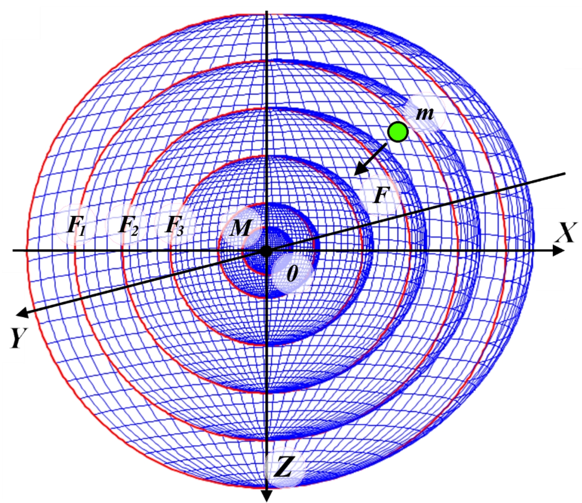 На рис.1.2 показано сечение группы сфер, в традиционных декартовых осях координат – XYZ. Сферы расположены с метрическим шагом, как обычные насечки на осях координат. Дополнительно рядом с осями показаны значения кривизны или силы притяжения F1, F2, F3. Каждому радиусу сферы соответствует та или иная кривизна или сила притяжения. В центре сфер показано массивное тело M, к которому притягивается тело m, показанное ранее на рис.1.1. Тело m теперь может перемещаться в трёхмерном пространстве в любом направлении, но в свободном движении из состояния покоя – только в сторону центра, к точечному телу M.