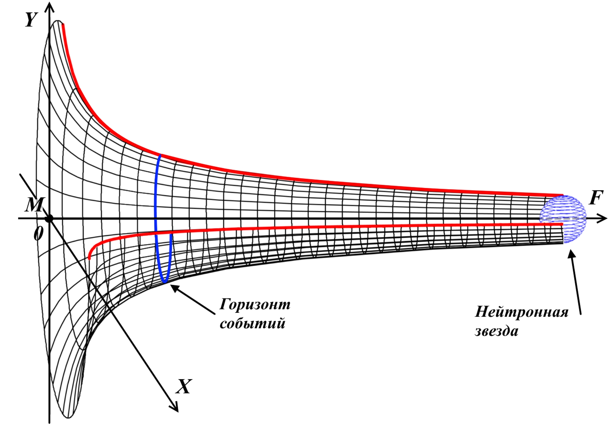 График сил теперь играет чётко ограниченную, определённую, назначенную ему роль. Он показывает, какая сила в каждой точке плоского пространства действует на подвижное тело со стороны массивного притягивающего тела – Чёрной дыры. Сама Чёрная дыра находится на самом деле не в том месте, где мы её изобразили для наглядности в виде нейтронной звезды. Чёрная дыра – это сингулярная точка, которая находится в начале координат, в центре плоскости X0Y. Именно к этой точке притягиваются все тела, находящиеся на плоскости X0Y. Сила этого притяжения на рисунке определяется длиной линии, соединяющей центр тела с соответствующей точкой поверхности, воронки кривизны, проекцией этого центра на поверхность кривизны.