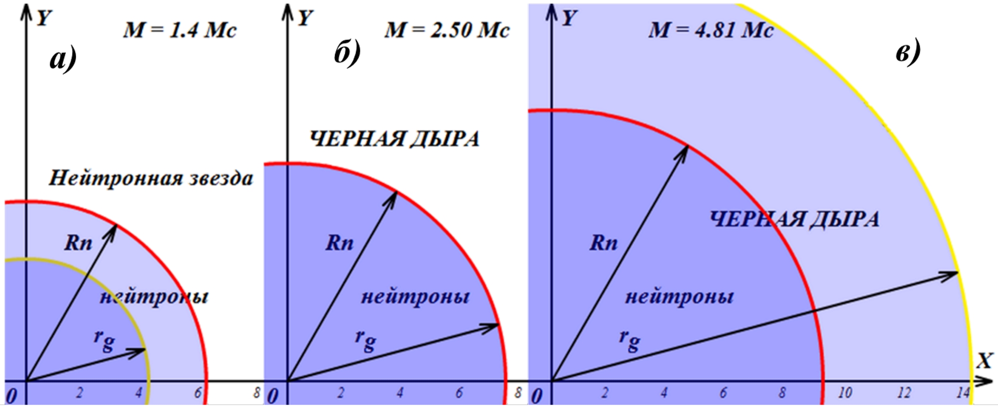 По мере роста массы нейтронной звезды растёт так же и радиус её горизонта событий. На первых порах, рис.2.2a горизонт событий находится внутри "лёгкой" нейтронной звезды. Начиная с момента, когда масса нейтронной звезды превысит примерно 2,5 массы Солнца, гравитационный радиус сравняется с радиусом нейтронной звезды, рис.2.2б. Теперь любое увеличение массы звезды приведёт к тому, что горизонт событий скроет её, рис.2.2в. Фигурально, последняя капля вещества в нейтронную звезду сделает её невидимой.