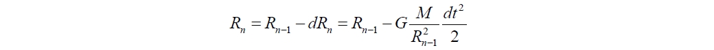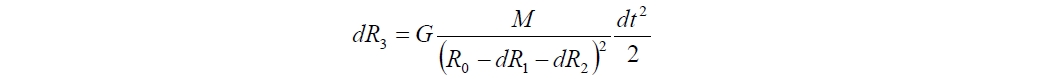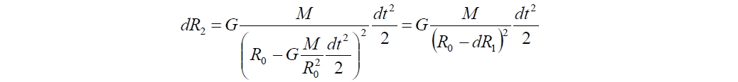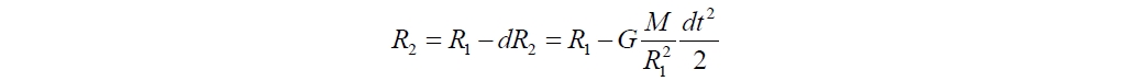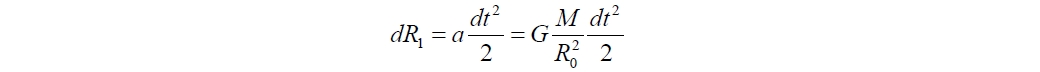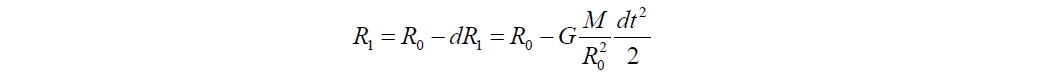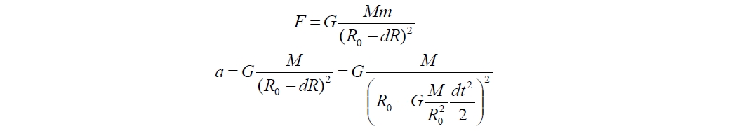 Теперь рассмотрим другой, простейший случай – тело m находится в покое на удалении R0 от массивного тела M. Это массивное тело искривляет пространство-время вокруг себе, что приводит в движение неподвижное изначально тело m. Определим закон движения этого тела. Изначально на него действует ньютонова сила