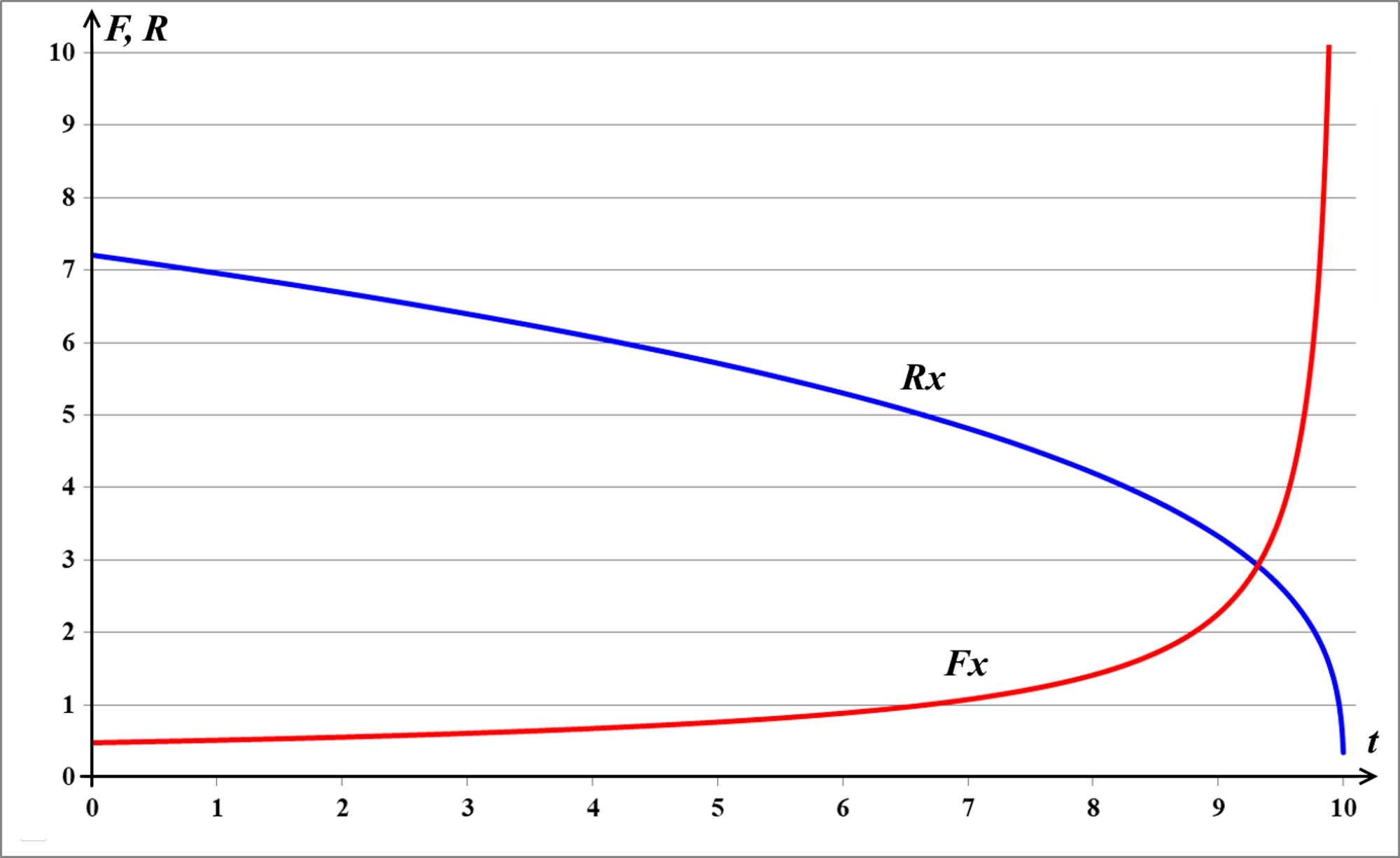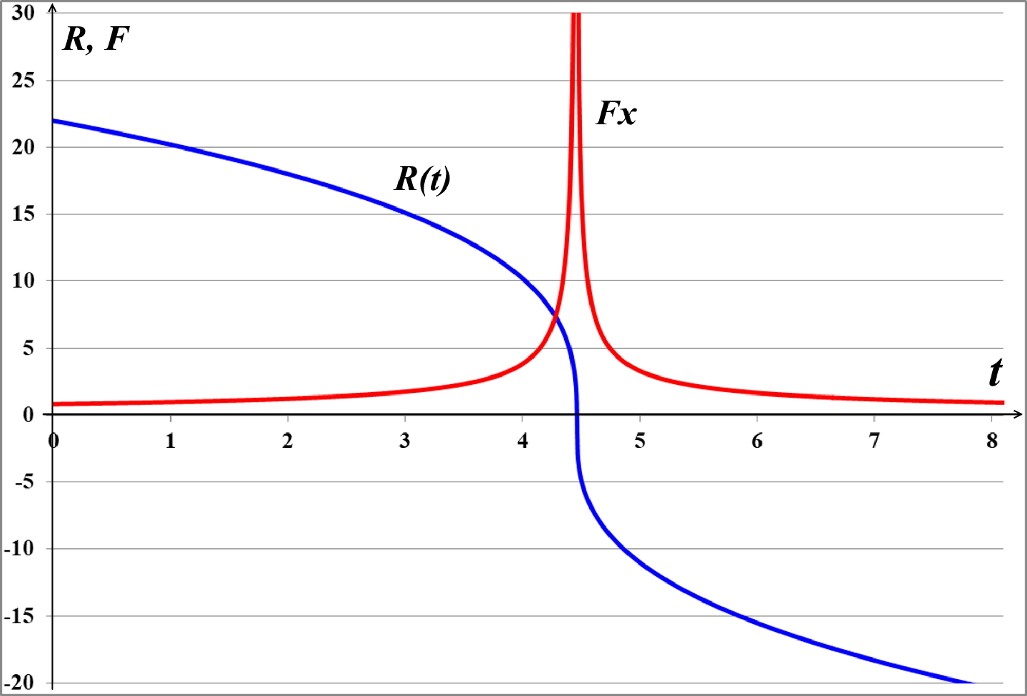 Рис.3.3. Пробное тело m падает на звезду M, но в последний момент траектория тела проходит мимо звезды, по другой координате (не показана). Вблизи звезды, на наименьшем удалении от неё сила Fx резко возрастает, пик уходит далеко за границы рисунка. Если развернуть время в точке пика, то график R(t) приобретёт вид параболы, соответствующей броску тела вверх в обозначениях физики Ньютона.