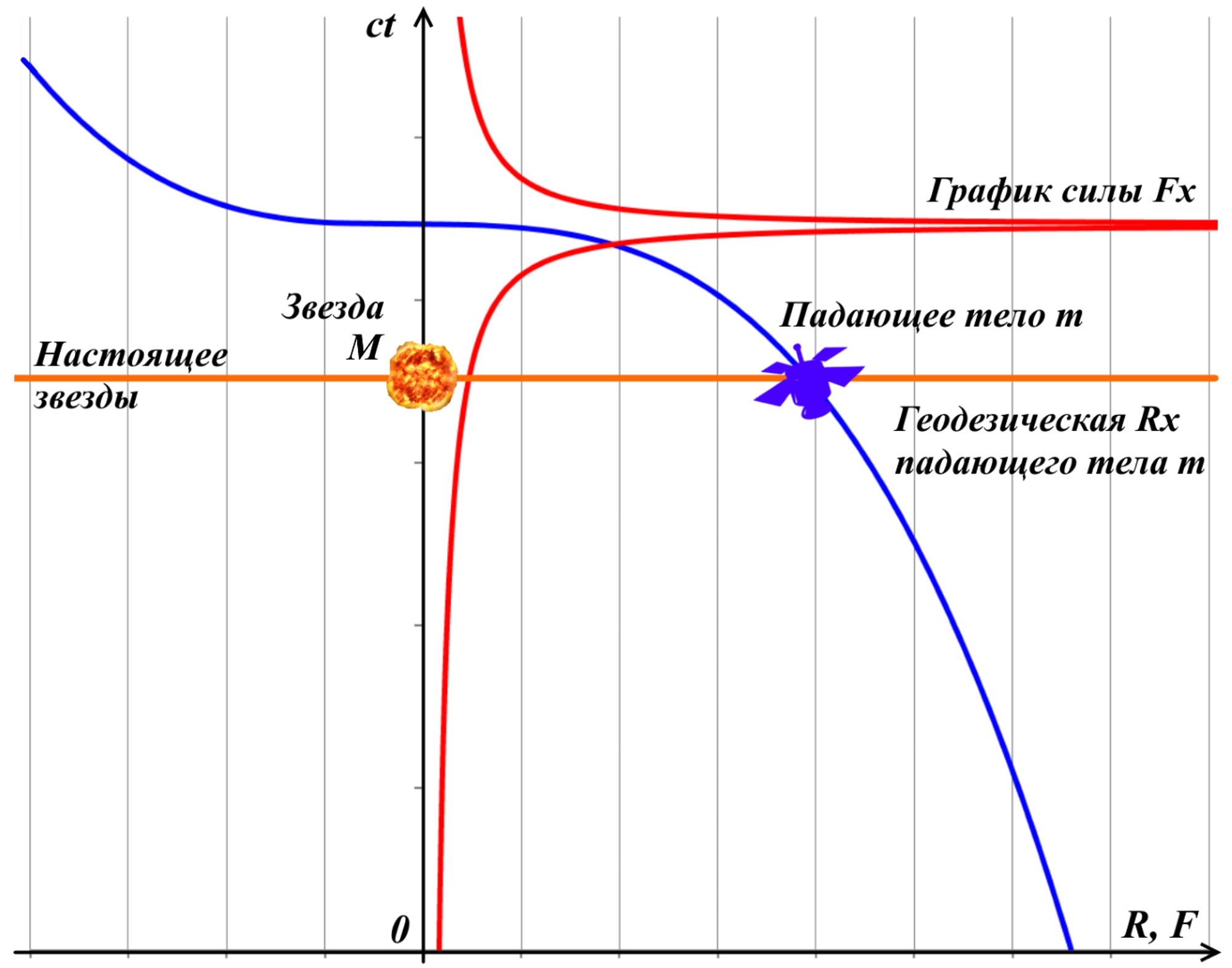 Теперь корабль отстыковывает спутник, и тот начинает падение в сторону звезды. Видим, что в начальный момент сила притяжения довольно мала, поскольку на этом удалении пространство-время практически плоское, не искривлено массой звезды. По мере приближения спутника, пробного тела m к звезде, его геодезическая Rx, сила и её эквивалент – искривление пространства-времени – растут относительно медленно. И лишь вблизи массивного тела, звезды кривизна и сила тяготения резко возрастают. В этой области мировая линия спутника начинает искривляться по квадратно-гиперболической кривой в сторону звезды. Искривление мировой линии, геодезической является результатом действия закона всемирного тяготения, являющегося квадратичной гиперболой.