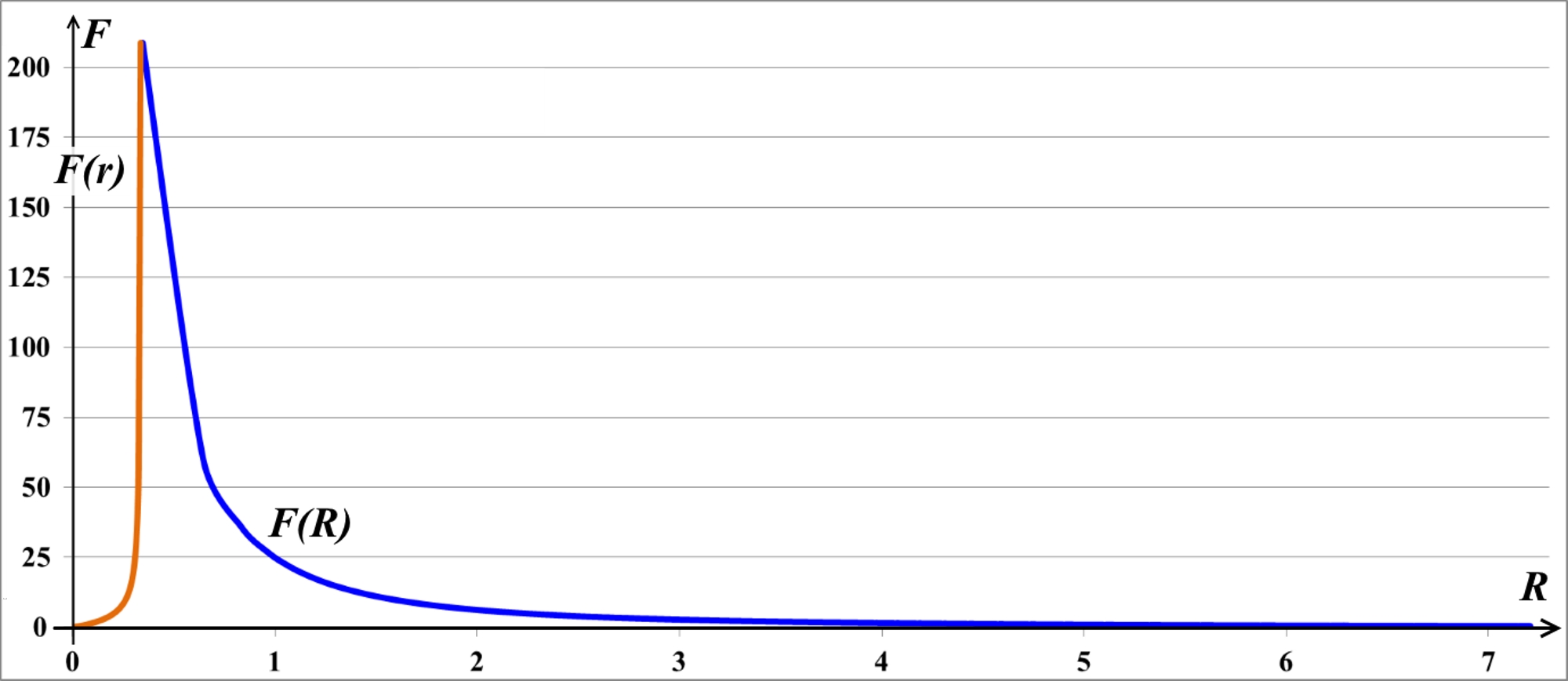 Рис.3.6. Образующая гравитационной воронки массивного объекта M – зависимость силы F(R) от удалённости с учётом размера звезды и её газообразности, то есть, возможности пробного тела m погрузиться в глубину звезды вплоть до её центра. Слева график дополнен силами F(r), действующими внутри массивного объекта.