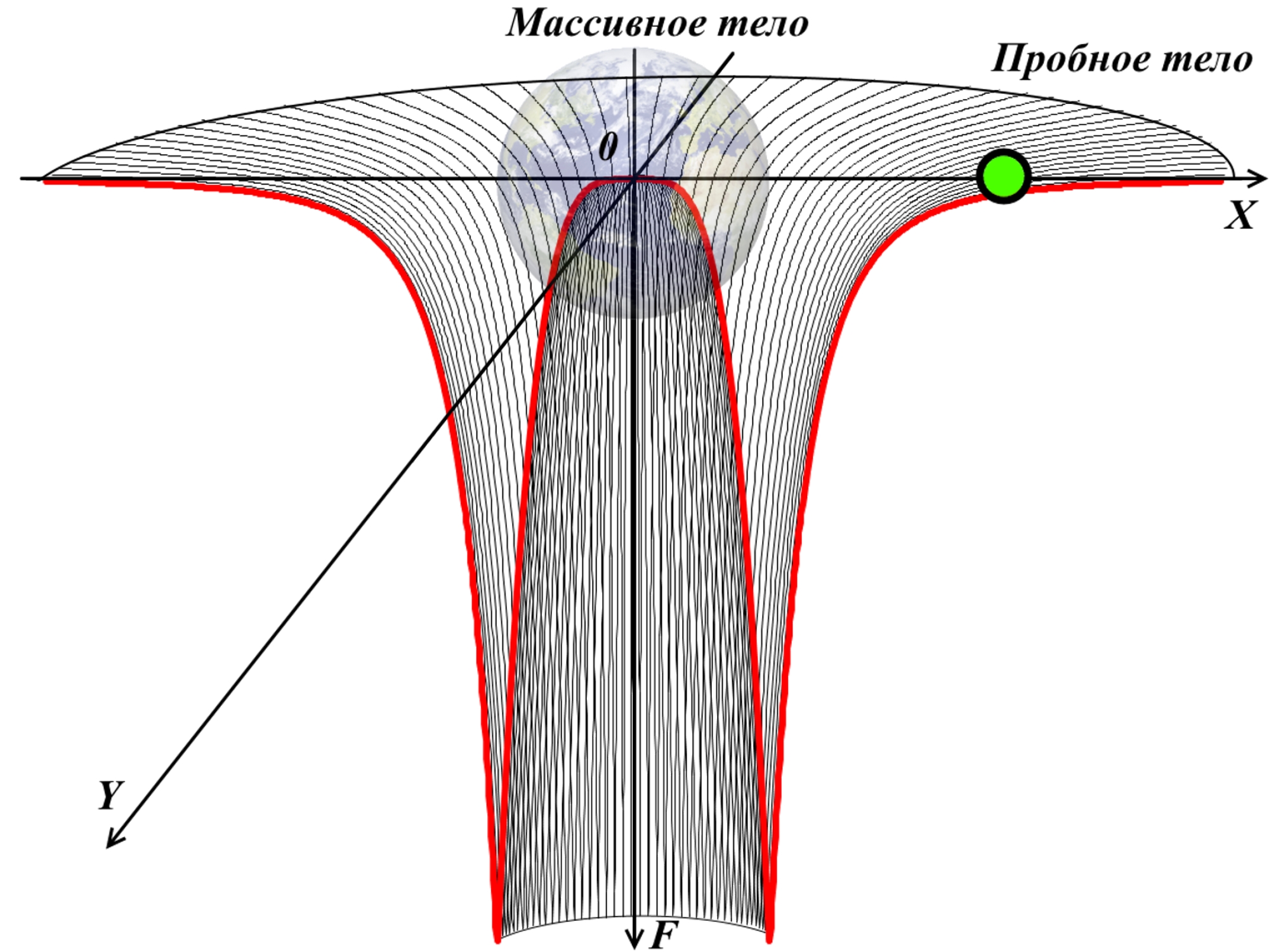 Рис.3.7. Гравитационная воронка массивного тела – разрез. Максимум силы притяжения – на его поверхности. В центре – нулевая гравитация. И массивное и пробное тело показаны в двухмерном пространстве X0Y, третья координата – сила – не является пространственной координатой.