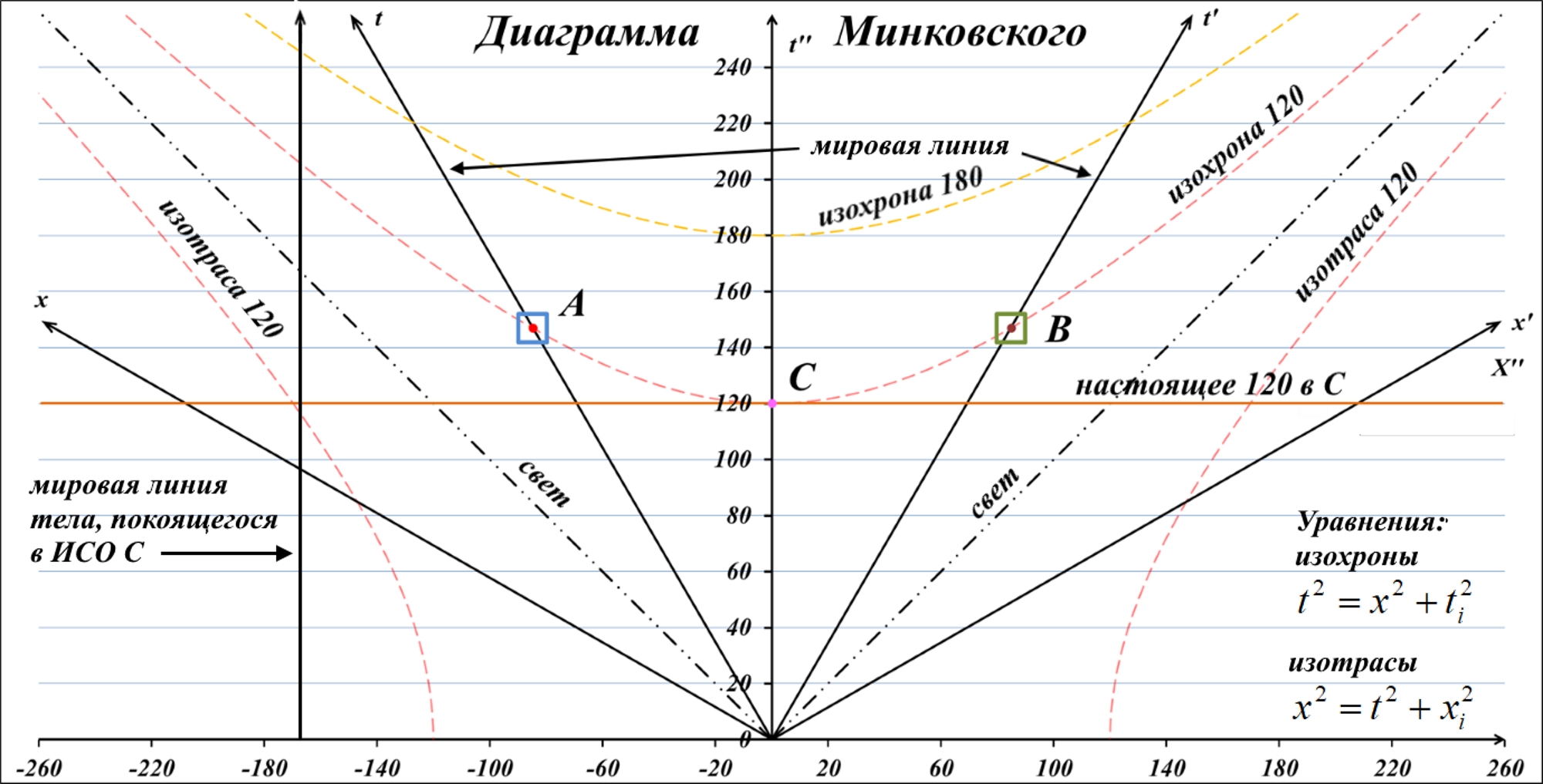 Все изохроны на диаграммах Минковского располагаются «вдоль» вертикальной оси ветвями вверх (движение в будущее) или вниз (движение из прошлого). К изохронам «ортогонально» располагаются соответствующие гиперболы, которые мы называем «изотрасами», – ветвями вправо (удаление от неподвижной ИСО вправо) или влево (удаление от ИСО влево). Это линии, отсекающие на мировых линиях расстояний отрезки равных дистанций (трасс), то есть, показывающие одинаковое расстояние от начала координат во всех движущихся ИСО. Уравнения изотрас