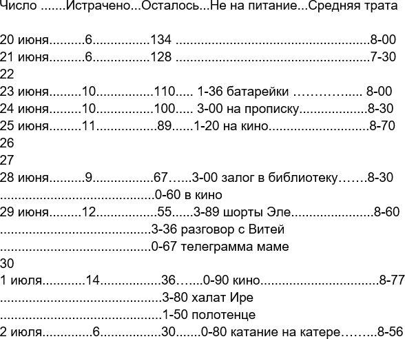 Ты знаешь, в среднем всё-таки в день у нас уходит по 8–50, 8–70. А мы рассчитали, что должны тратить по 7–70. Так что, не знаю, как у нас выйдет дальше. Правда, не всё идёт на питание.