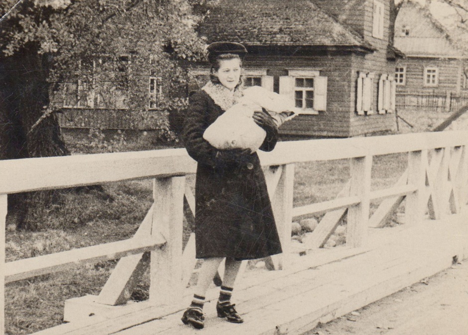 Мама со мной на руках стоит на том самом деревянном тротуаре, а за спиной домишки, в которых квартировались пилоты со своими семьями.