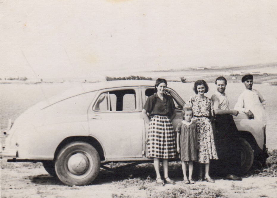 Наша «Победа», рядом тетя Надя, я, мама, отец, дедушка Емельян.