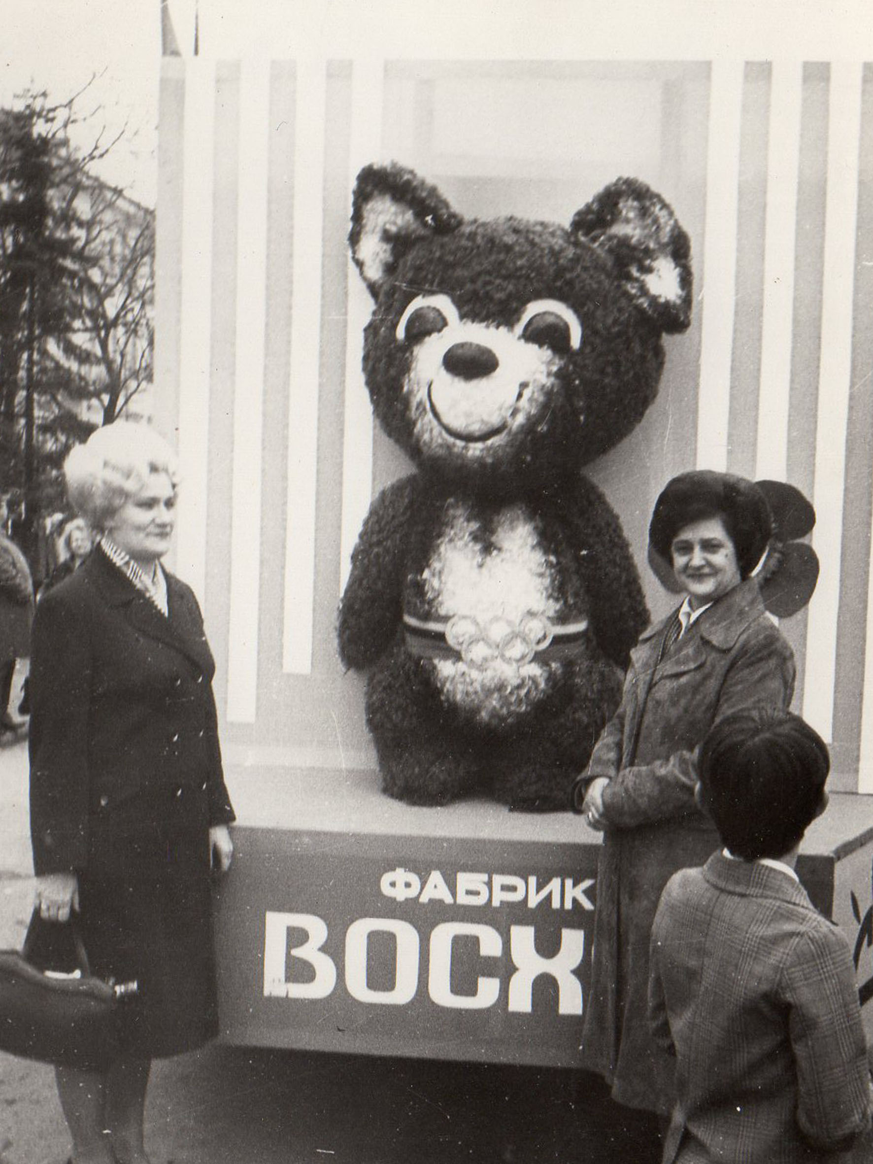 На фотографии – демонстрация 1980 года. Впереди колонны – большой олимпийский мишка – популярная «Восходовская» игрушка того года, справа стоит директор – моя мама, Нина Ивановна Алефиренко, слева – кажется главный инженер – Таисия Петровна.