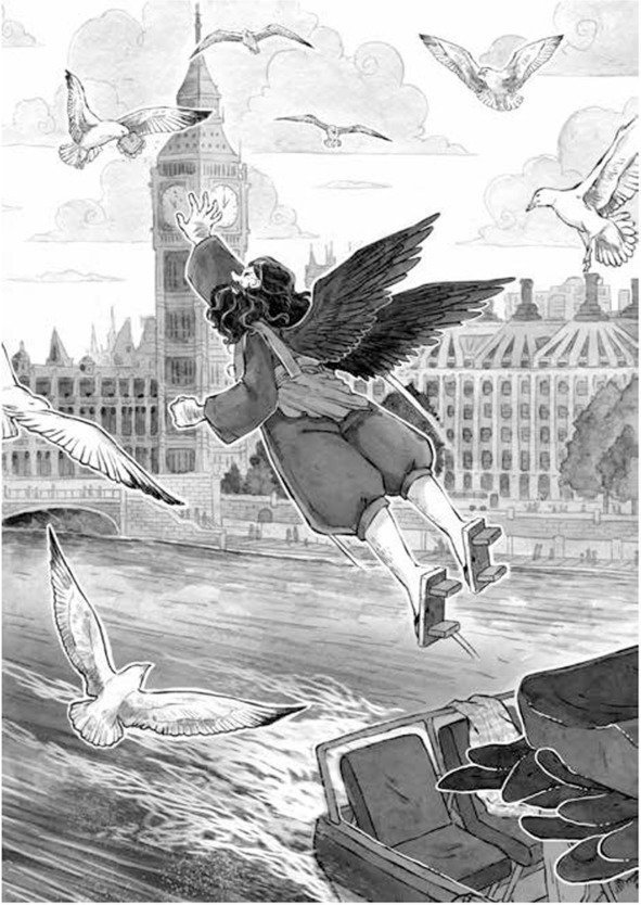Наши друзья, сидящие в центре кораблика и слушающие рассказы Эдварда, ничего и не заметили, но на набережной началась суматоха: люди указывали пальцами в небо, кто-то бросился на колени и начал молиться, ребятишки визжали от восторга. (На следующий день в центральной газете появился снимок с летящим за чайками тэнгу. В статье приводилось несколько версий, объясняющих полёт неведомого существа: фотограф, снявший явление над Темзой, полагал, что это очень крупная птица; известный учёный заявил, что это был обычный человек на дельтаплане; в сводках комиссии по аномальным явлениям авторитетно заявили, что над Темзой пролетел НЛО (неопознанный летающий объект); а главный редактор газеты предположил, что все видели крошечный аэроплан. Тётя Джейн специально купила для Содзёбо несколько экземпляров газеты, чтобы счастливый от свалившейся на него известности тэнгу мог увезти их в Японию.)