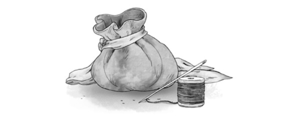 Тётушка Джейн подошла к Кею, взяла из его лапки мешочек и, достав нитки с иголкой из шкатулки для рукоделья, быстро пришила к нему кончики своего узенького нашейного платка.