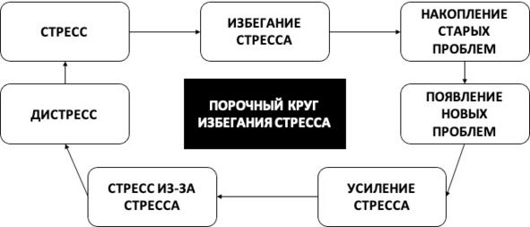 Таким образом, залог счастливой жизни состоит не в отсутствии стрессов и не в умении избегать любых переживаний, а в развитии навыков стрессоустойчивости. Действительно, попытки избегания стресса зачастую только усугубляют стресс, и бегство от решения проблем лишь добавляет напряжения к уже имеющемуся стрессу, ведь накопившиеся проблемы не решаются и множатся, и к тому же появляются новые проблемы. По причине накопления старых и образования новых проблем вы испытываете более сильный стресс, мешающий эффективно справляться как с проблемами, так и с самим стрессом, и, в конечном итоге, можете начать испытывать стресс из-за стресса, что как раз и ведёт к вышеописанному дистрессу (см. рис. 3). Однако формирование нового, более рационального и реалистичного мышления способствует не только эффективному решению проблем, развитию стрессоустойчивости и саморазвитию, но и профилактике различных тревожных и депрессивных состояний и дистресса.