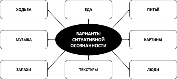 В кратком формате вышеописанная условная последовательность практик осознанности выглядит следующим образом (напомним, что вы можете выполнять эти действия отдельно друг от друга в разное время) (см. рис. 9).