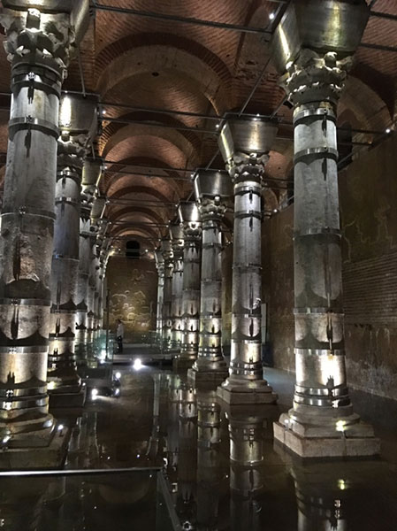 Здесь тихо и прохладно, уютно и торжественно. Красиво смотрятся обручи, которыми укреплены многочисленные колонны, самые дальние из которых можно потрогать руками и ощутить их прохладу. Пол цистерны залит водой, которая, словно зеркало, отражает весь этот лес колонн, освещенных прожектором, и создает поистине таинственную обстановку.