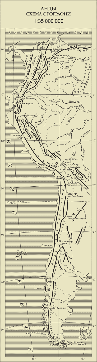 По особенностям природных условий и орографии Анды подразделяются на Северные, Центральные и Южные. Северные Анды (до 4° ю. ш.) включают Карибские Анды на С. Венесуэлы (вдоль берега Карибского моря); Северо-Зап. Анды состоят из трёх Кордильер (Зап., Центр. и Вост.); Экваториальные Анды представлены двумя Кордильерами (Зап. и Вост.). Здесь находится много вулканов: Чимборасо (6310 м), Котопахи (5896 м) и др. Центральные Анды (до 28° ю. ш.) включают Перуанские Анды и наиболее широкую часть Анд, называемую Центральноандийским нагорьем. Южные Анды представлены Чилийско-Аргентинскими Андами, состоящими из двух параллельных хребтов: Береговой и Главной Кордильер с Продольной долиной между ними, и Патагонскими Андами на самом Ю. континента.