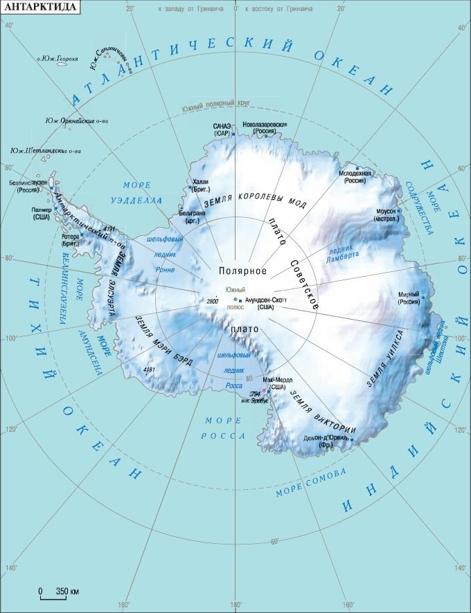 Поверхность большей части Антарктиды представляет собой обширное ледниковое плато, поднятое на выс. 3000 м и более. Центр. часть Вост. Антарктиды занимает плато Советское (выс. до 4000 м); к С. поверхность понижается, образуя широкую долину. Вдоль побережья тянутся горные хр. Земли Королевы Мод, горы Принс-Чарлз и др. Поверхность Зап. Антарктиды в целом значительно ниже, горные хребты расположены в глубине материка (высшая точка континента в горах Элсуорт, 5140 м) и вдоль побережья. Подлёдный рельеф представляет собой чередование высоких горных поднятий и глубоких впадин. Осн. поднятия: горы Гамбурцева и Вернадского. В центр. части материка придонные слои льда находятся при тем-ре таяния. В депрессиях коренного рельефа скапливается жидкая вода и возникают т. н. подлёдные озёра. Подобное крупное озеро находится в р-не станции «Восток»; его дл. 260 км, шир. до 50 км, толща воды превышает 600 м.