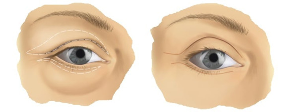 Представленная операция проводится при избыточном нависании кожи над глазными яблоками, а также при выпячивании грыжевых пакетов над глазами. Процедура выполняется под местной анестезией. Разрез проводится вдоль естественной кожной складки на верхнем веке. Ушивается шов внутрикожно, а вдоль линии разреза наклеиваются специальные пластырьки в цвет кожи. Они снимаются на 5-е сутки после операции. (РИС.9) Синячки и отек полностью проходят к 12—14 суткам.