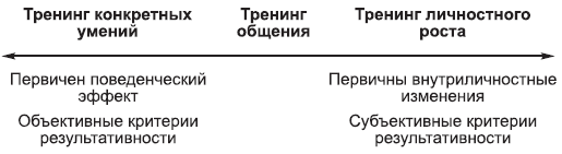 Психологические тренинги характеризуются большим разнообразием и могут быть классифицированы по различным основаниям. Если классифицировать психологические тренинги в зависимости от целей, их можно условно разделить на тренинги конкретных умений (их цель – выработка поведенческих навыков) тренинги личностного роста (в их основе – создание условий для саморазвития участников, развития рефлексивных способностей, повышения открытости новому опыту). В первом случае опора делается на внешний, поведенческий эффект, который впоследствии может вызвать и изменения личности. Во втором случае основной эффект наблюдается во внутреннем плане – сначала происходят внутриличностные изменения (самооценка, мотивация, ценностные ориентации и т. д.), а потом, как следствие, может измениться и поведение. Соответственно различаются и критерии результативности тренингов – в первом случае они преимущественно объективные (уровень развития тренируемых умений), во втором – субъективные, получаемые путем самоотчетов участников о том, что дал тренинг лично им.