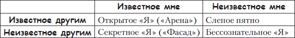 Для иллюстрации участникам целей тренинга (особенно в области личностного роста) ведущие довольно часто используют так называемое «окно Джохари» (по именам разработчиков – Джо Люфта и Харри Ингрэма). Оно представляет собой таблицу из четырех клеток. Ведущие порой прибегают к метафоре: вот окно, через которое личность глядит на окружающий мир, а окружающие – на нее; в раму вставлены четыре стекла: одно из них (открытое Я) «обоюдопрозрачно» – то, что попадает в эту область, одинаково видно как самому человеку, так и окружающим; следующие два стекла – тонированные, как в дорогих иномарках, позволяющие видеть только в одну сторону. Установлены они таким образом, что через одно из них «хозяину» все видно, а окружающим внутрь не заглянуть (секретное Я), через другое же стекло, напротив, хозяину ничего не видно, зато окружающим прекрасно все видно («слепое пятно»). Наконец, последнее стекло – матовое, через него ничего не разглядеть (бессознательное Я).