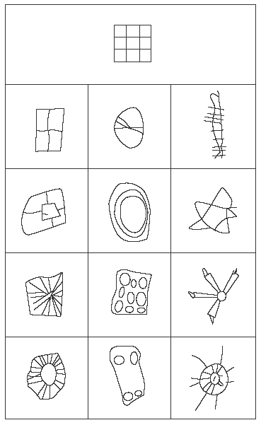 А. Шварц подчеркивал, что в первом случае своеобразие изменения воспринимаемой фигуры детьми обусловлено особенностями двигательно-аффективных переживаний, которые возникают при восприятии объекта и его изображении. Второй тип трансформации основан на зрительно-символическом изображении воспринимаемого объекта. Ребенок символизирует наиболее значимые свойства объекта, как бы уточняя и гротескно выделяя их. Такой тип трансформации становится наиболее заметным, когда перед детьми ставится задача перерисовать треугольник. В этом случае дети рисуют овальный контур, напоминающий треугольник, но при этом в тех местах, где должны быть острые углы, пририсовываются дополнительные черточки, которые символизируют наличие остроты углов. А. Шварц специально предлагал детям 3–6 лет нарисовать квадратную решетку после тактильного ее восприятия (рис. 5). Оказалось, что только некоторые дети смогли адекватно передать структуру решетки (первая колонка на рисунке); часть детей ориентировалась при изображении лишь на различные виды дырявости (вторая колонка на рисунке); другие, наоборот, были сосредоточены на изображении углов (третья колонка на рисунке). Таким образом, восприятие фигур дошкольниками принципиально отличается от восприятия взрослого человека, поскольку оно опирается на иные процессы структурирования (связанные с отражением ситуации на основании, как правило, одного признака, который определяет всю структуру ситуации).