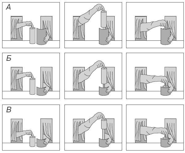 2. Детям 4,5 месяца демонстрировали манипуляции с объектом и загородкой разной формы (рис. 7). Во втором случае (Б) дети значительно дольше смотрели на происходящее, чем в первом случае (А). В контрольном эксперименте дети смотрели на происходящее столько же, сколько в случае длинного объекта и высокой перегородки (В). По мнению Р. Байларгеон, это объясняется наличием соотнесения у младенца высоты загородки и объекта – дети были удивлены, когда объект, по длине превышающий высоту загородки, «помещался» за нее целиком[14].