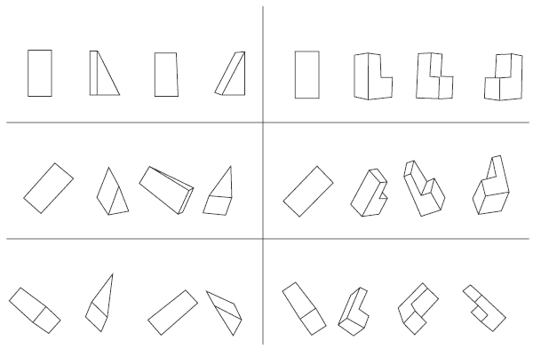 Рис. 10. Вращение треугольной призмы и прямоугольной призмы с углублением на одной стороне по трем осям (эксперимент Ф. Кельмана и К. Шорт).