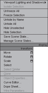 Если щелкнуть правой кнопкой мыши в любом месте окна проекции, откроется контекстное меню. Состав данного меню меняется в зависимости от того, в каком месте сделан щелчок. Например, на рис. 1.7 показано контекстное меню, которое появляется при щелчке в окне проекции правой кнопкой мыши. При этом никакие объекты сцены не были выделены.