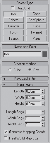 Объекты можно создавать не только вручную, но и путем ввода значений параметров в свитке Keyboard Entry (Ввод с клавиатуры). Для построения объекта, например Вох (Параллелепипед), по заданным значениям параметров сделайте следующее.