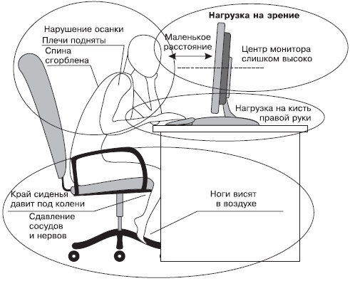 Рис. 2.1. Опасности для здоровья, которые подстерегают человека, работающего за компьютером