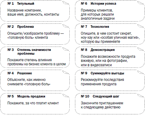 10 слайдовСовременная структура продающей презентации – это перечень контрольных точек маршрута, по которым в обязательном порядке должен проследовать успешный презентатор. Метафора для описания сути базовой структуры продающей презентации – медицинская. «Диагноз такой-то, лечим так-то, через месяц – здоров как бык». Сначала вы описываете проблему, «головную боль» клиента. Затем демонстрируете, как с помощью продукта можно решить эту проблему и соответственно избавить «больного» от недомогания. Цель – дать столько информации, сколько нужно для перехода на следующий уровень взаимоотношений. И не более того! Ниже перечислены 10 опорных точек-слайдов (см. также форзац книги) для построения нужной структуры.