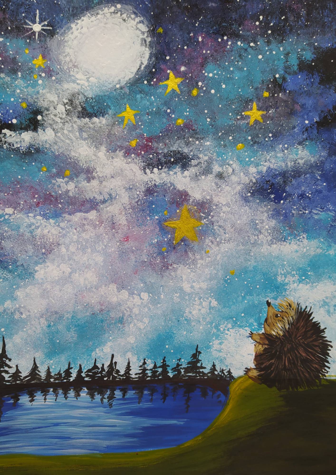 Ёжик сидел на краю берега и мечтал, глядя на звездное небо. Ему казалась, что небо оживает, до него доносился еле уловимый шум: то ли это было пение, то ли смех. Он не мог разобрать.