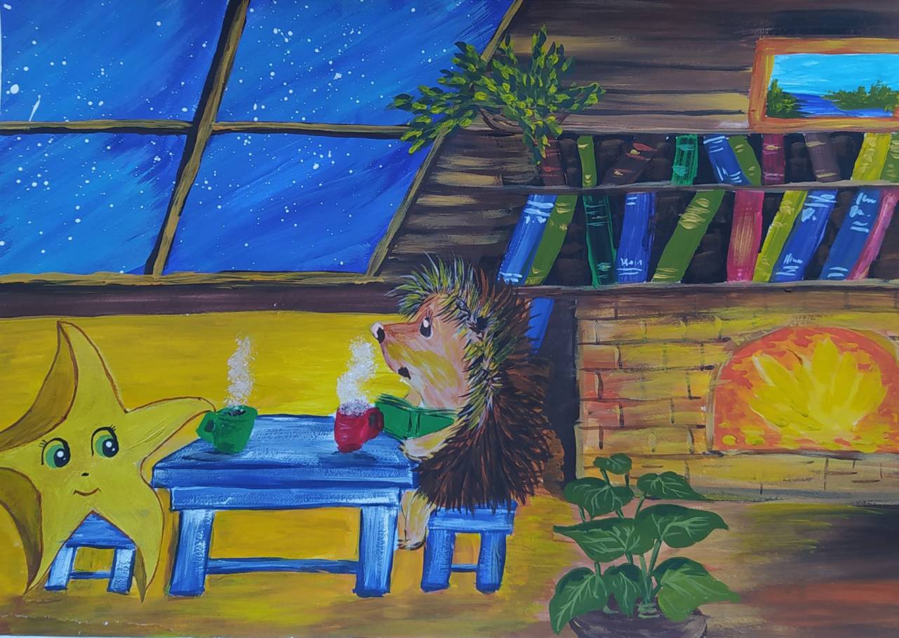 Теперь каждый вечер Ежик все так же сидит у реки. Рядом с ним, ярко сверкая, сидит Звёздочка. Они сидят, прижавшись, друг к другу, любуясь ночным небом. Сидят до самого рассвета. И лишь когда солнце появляется на горизонте, Ёжик очень аккуратно берет в лапки уставшую сонную Звёздочку и несет в норку. Ведь звёзды днем не светят на небе, они днем спят! Ёжик укладывает Звёздочку на кровать, накрывает ее одеялом из листьев и ложится рядом с ней.
