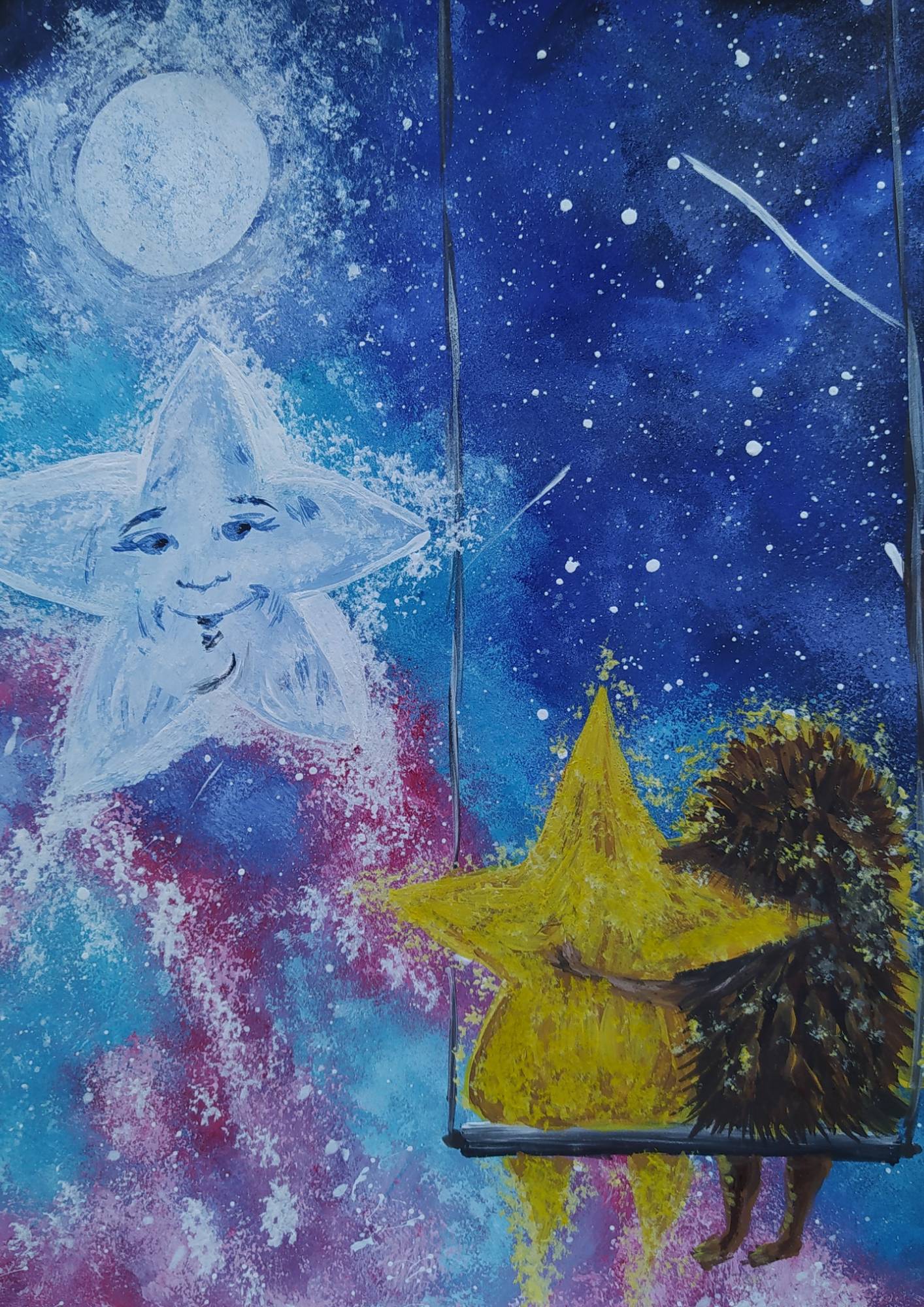 Качели бесшумно скользили по небу, словно лодка по реке. Ёжик вспомнил о своей реке и подумал: «Как здорово, что мечты сбываются!». Когда-то он сидел на берегу и мечтал о полете в ночном небе, а теперь парит под звездным куполом на качелях, а рядом с ним его лучший друг – Звёздочка.