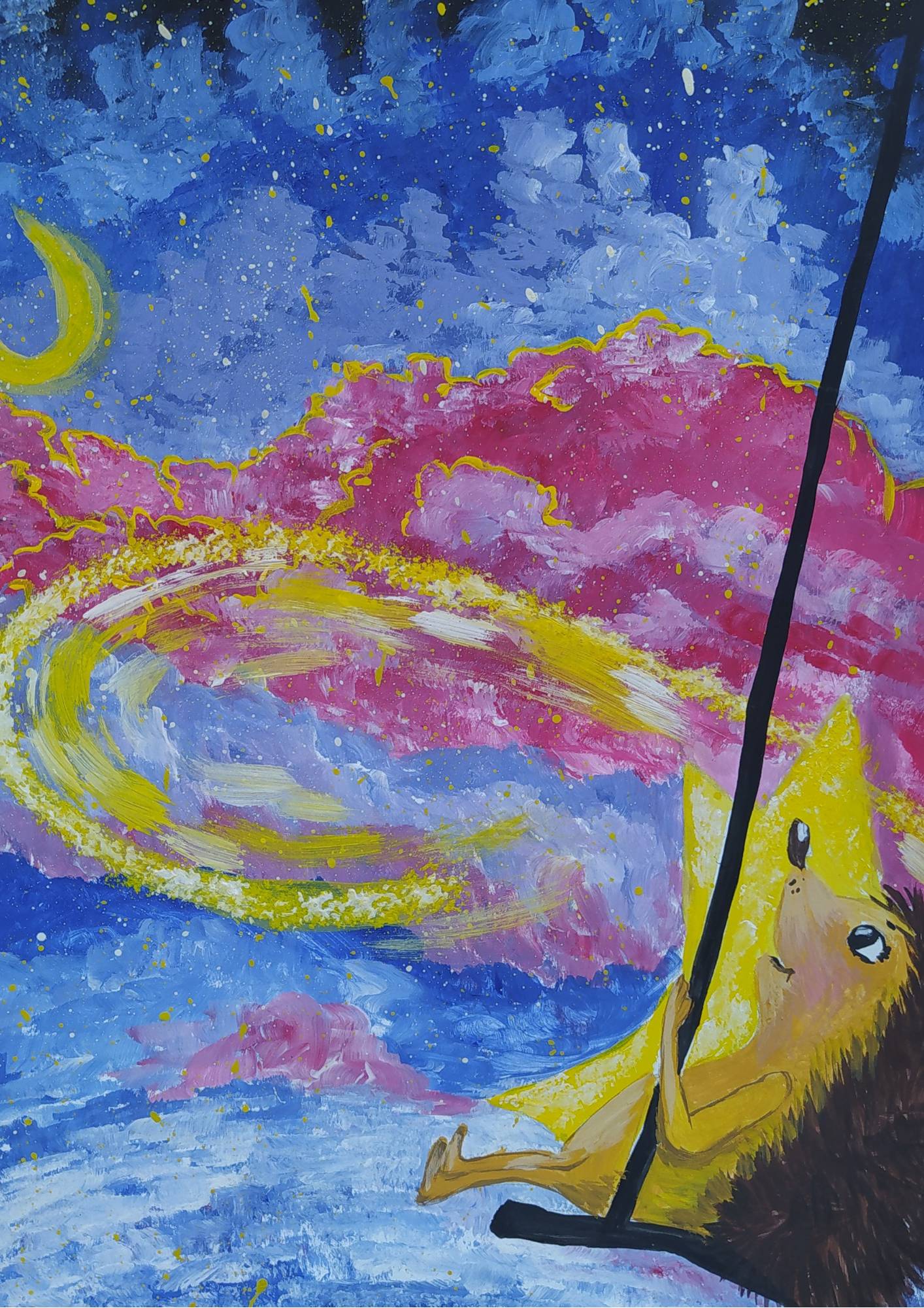 Звездные Качели бесшумно передвигались по Звёздному Небу. Словно кто-то невидимый плавно раскачивал их. От этого у друзей захватывал дух! Ёжик подумал: «Небо – живое, огромное и красивое». Оно двигалось вместе с путешественниками, преображаясь каждую минуту: то было похоже на грозовую тучу, то становилась прозрачным, словно лед в ручейке. Оно меняло своё одеяние и краски, окрашиваясь в разные цвета и оттенки: от сине-фиолетового до красно-бордового. Небо манило друзей, приглашая окунуться в себя. Оно играло с ними в волшебную игру, показывая свою красоту и великолепие.