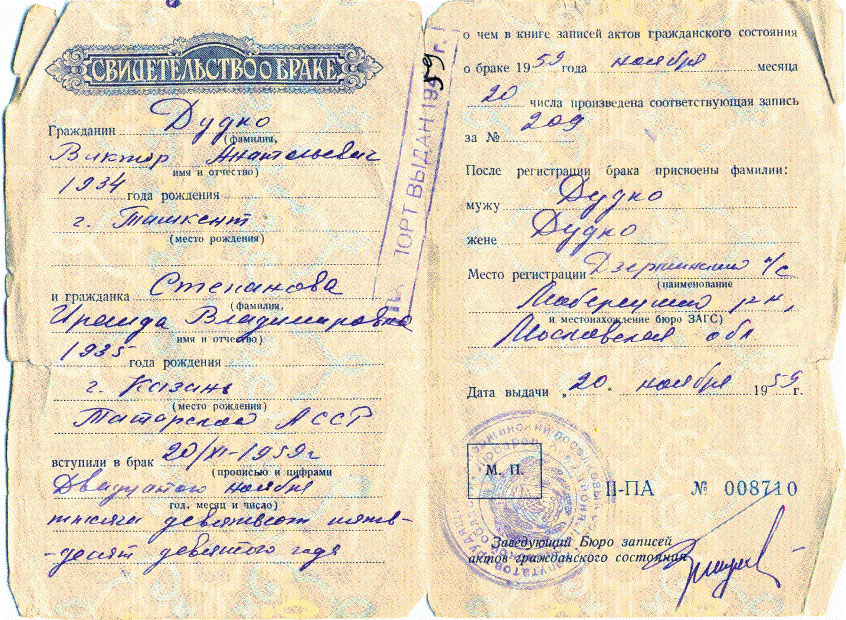Мы пришли домой, показали всем «Свидетельство», и выяснили, что в нём допущена ошибка. На левой страничке было написано, что в брак вступает – Степанова Ираида Владимировна. На правой страничке – фамилия жены. И там, вместо Дудко, тоже было написано – Степанова…
