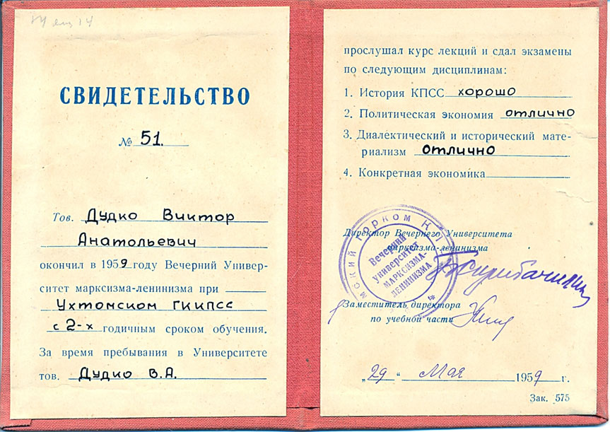 СОБЫТИЯ 1959 ГОДАВ этом году я окончил Вечерний факультет Марксизма – Ленинизма.
