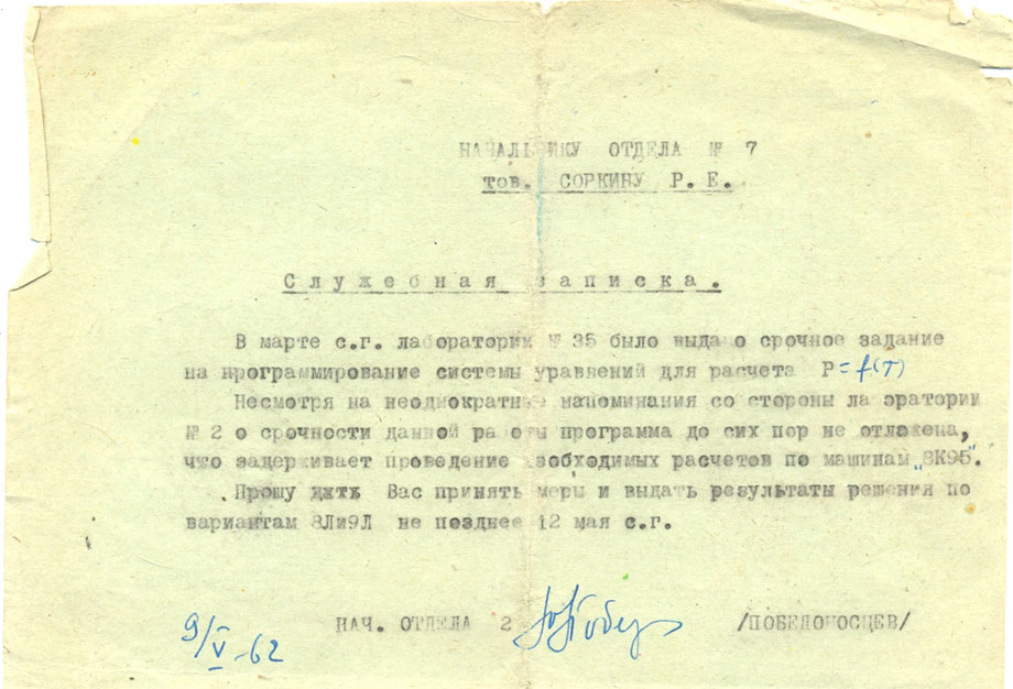 9. V. 62 Начальник отдела № 2ПОДПИСЬ………………………………………………/ПОБЕДОНОСЦЕВ/Вот так, у меня сохранился «автограф» ПОБЕДОНОСЦЕВА, хотя и на такой, не совсем лестной, служебной записке.