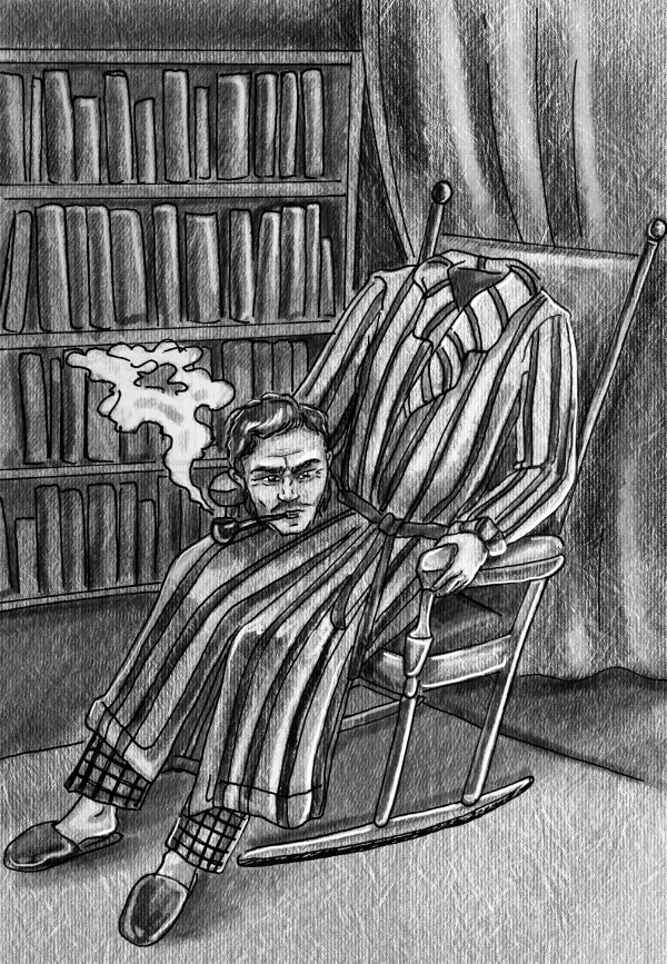 За углом прямо посреди кабинета в кресле-качалке раскачивался человек с другой картины. Тот самый, что держал на коленях собственную голову. На сей раз голова зажала в зубах трубку и курила. Тварь сидела к Мэри вполоборота, и Шубина могла отчётливо видеть, как толстые щёки с бакенбардами надуваются, а затем выпускают струю сизого дыма.