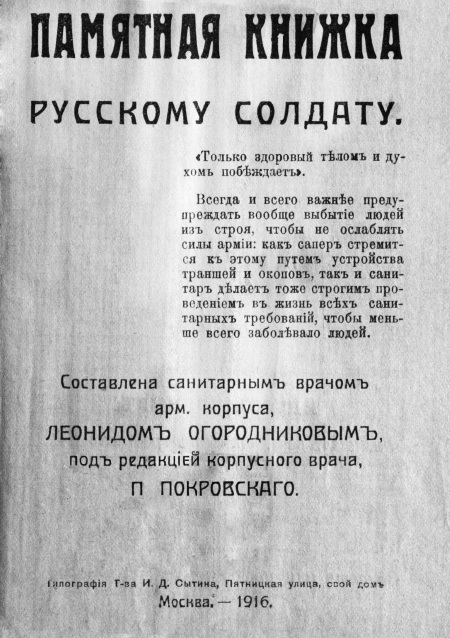 «Памятная книжка русскому солдату», составленная санитарным врачом Леонидом Огородниковым, была издана в Москве осенью 1916 г. Ее прямое назначение – дать солдату русской армии ясное понятие о целях войны, о его месте в совершающихся событиях, привить отчетливое понимание необходимости заботиться о своем нравственном и физическом здоровье. Подобные памятные книжки в годы войны создавались разными авторами и предназначались для каждого солдата тех или иных частей русской армии. Стоит напомнить, что солдат русской армии того времени обязан был уметь читать и писать. Данная книжка выделяется тем, что она получила одобрение начальника штаба 3-й армии генерал-лейтенанта А.К. Байова: «И по идее, и по исполнению такой календарь очень полезен. Желательно распространение его в войсках».