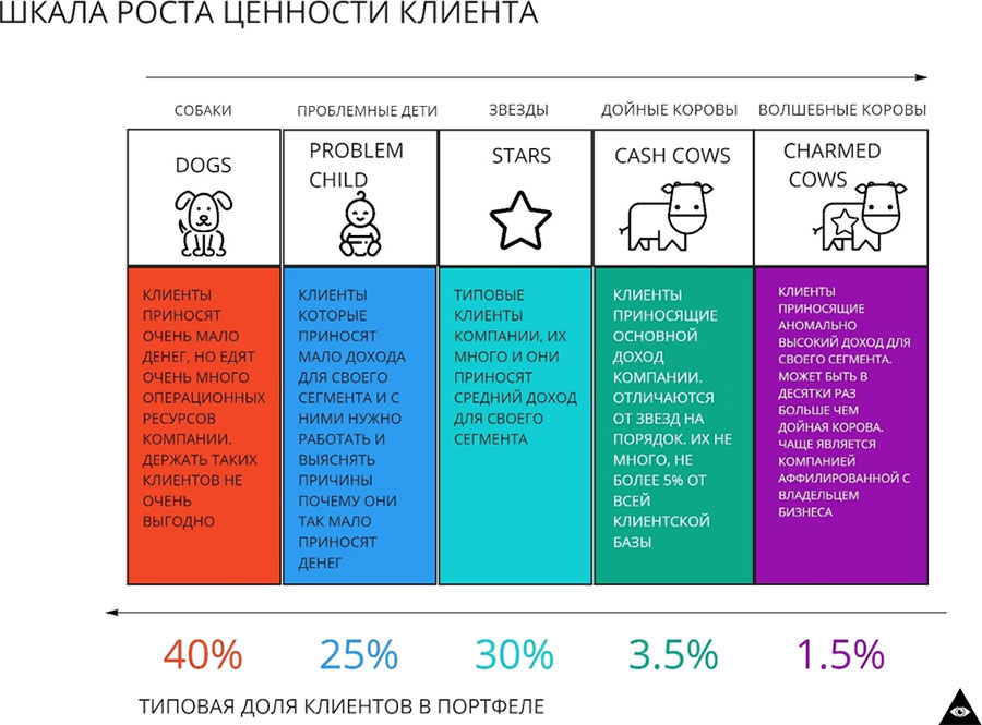 Если вы разложите все своих клиентов по этим категориям, то можно будет сказать с кем вы любите работать, а с кем нет и на что уходят ресурсы:
