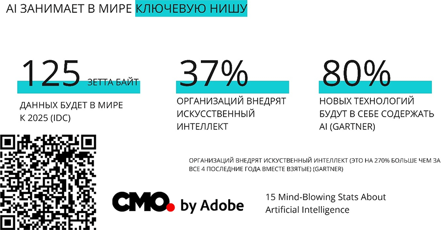 Если интересно, то Adobe, один из лидеров в сфере digital маркетинга и аналитики собрал интересный обзор того, что будет происходит с искусственным интеллектом и данными ближайшие пару лет.