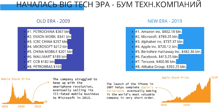 Ровно 10 лет назад 8 крупнейший компаний в мире, были китайский банки, американские нефтяные и ритейл компании. Сейчас это всем известные Amazon, Microsoft, Apple и т. д. Довольно интересно наблюдать как падала и росла стоимость акций Nokia и Apple за это время. 10 лет хватило инвесторам, чтобы полностью переключить свой капитал с одного рынка на другой. Конечно, пока непонятно, что будет востребовано через 10 лет следующих, и куда дальше двинется капитал. Возможно это будут био-тех технологии, помогающие улучшать геном человека и т. д., чтобы мы все не болели. Ну поживем посмотрим). В целом цифровая экономика поражает своими цифрами и экономическим эффектом: