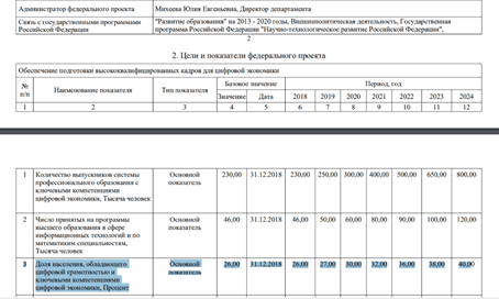 Это средний уровень проникновения компьютерной грамотности в европейских странах. Эти буковки, это сокращения названия стран, а столбик означают 2 типа навыков: 1) базовые навыки пользоваться Интернетом, как средой, 2) продвинутые навыки, это фактически те люди, которые используют свои навыки в работе. Как видите их не так много, если брать среднюю величину, то получается, что в среднем только 57 % населения Европы умеет работать в Интернете и в это в 2020 году, 21 веке. Только 57 %, представляете. В отдельных взятых странах, этот коэффициент заметно ниже, где-то он достигает 30 % процентов, это значит, что из 10 людей, только 3 умеют и способны пользоваться интернет – услугами. Да, картинка довольно необычная. А теперь представьте нашу страну, в нашей стране 72 млн пенсионеров, это почти 50 % населения, а в целом доля населения, которая обладает цифровыми навыками сейчас довольно небольшая в России. Ее повышением является одна из задач национального проекта “Цифровая экономика”, того самого о котором так все много говорят со всех экранов. Если быть точнее, то цель, чтобы к 2024 минимум 40 % населения нашей страны обладало цифровыми навыками. Сейчас это значение, в соответствии с паспортом проекта “Кадры для цифровой экономики” составляет всего 26 %. Это значение было измерено 31.12.2018. Ниже показан, прирост этого показателя по годам: