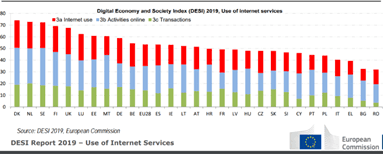 Одним из интересных параметров, которые характеризуют степень цифровизации экономики является частота использования интернет-услуг (Use of Internet Services). Фактически, это сколько граждан той или иной страны совершают онлайн операций, действий, т. е. в целом это активность граждан в сети. Это может быть любые действия в Сети, – совершение покупок, общение в соц. сетях, пользование мобильным банком и тд. Если посмотреть график по Европе за 2019 год: