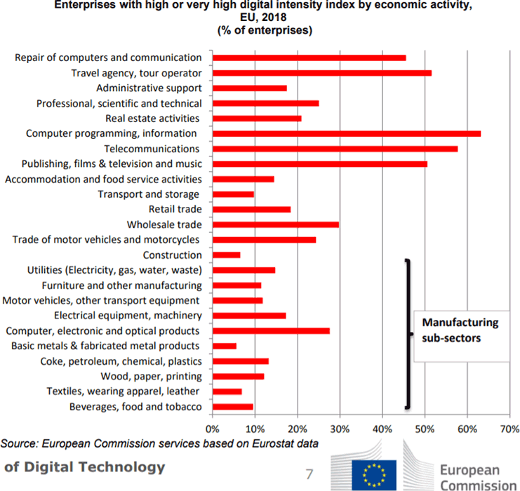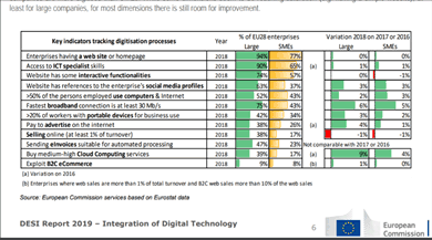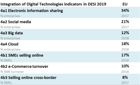 Долю цифровизации бизнеса в Европе оффициально измеряют использованием сервисов соц. сетей, использованием технологий Bigdata, облачных технологий, способом продажи товаров и услуг через интернет, оборотом в электронной торговле, в том числе международной торговле