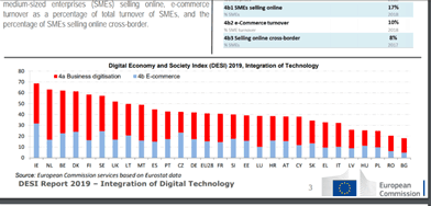 Основный смысл в том, насколько цифровые технологии проникают в бизнес. Фактически в Европе выделяют 2 области проникновения, это 1) степень цифровизации или использования цифровых сервисов в бизнесе; 2) это степень развития электронной торговли (e-commerce). Уровень цифровизации компаний в Европе сравнительно небольшой, при этом в отдельных сферах применения технологий, оно очень маленький, например только 18 % компаний признались, что используют облачные технологии для своего бизнеса. Что такое облачные технологии, это аренда серверов в больших дата центрах, чтобы разместить на сервере сайт своей компании, это использование различных почтовых сервисов от компаний Microsoft, Google и тд. для ведения переписок с клиентами, это использования различных сервисов телефонии, например, вы арендуете номер 8–800, вам звонят на него и происходит переадресация звонка на ваш телефон. Аренду самого номера и настройки переадресации, вы делаете в облачном сервисе. В целом только пятая часть компаний в Европе может сказать, что они цифровизированы.