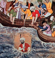 Исламская картина XVI века, изображающая Александра Македонского, погружающегося под воду в стеклянном сосуде.