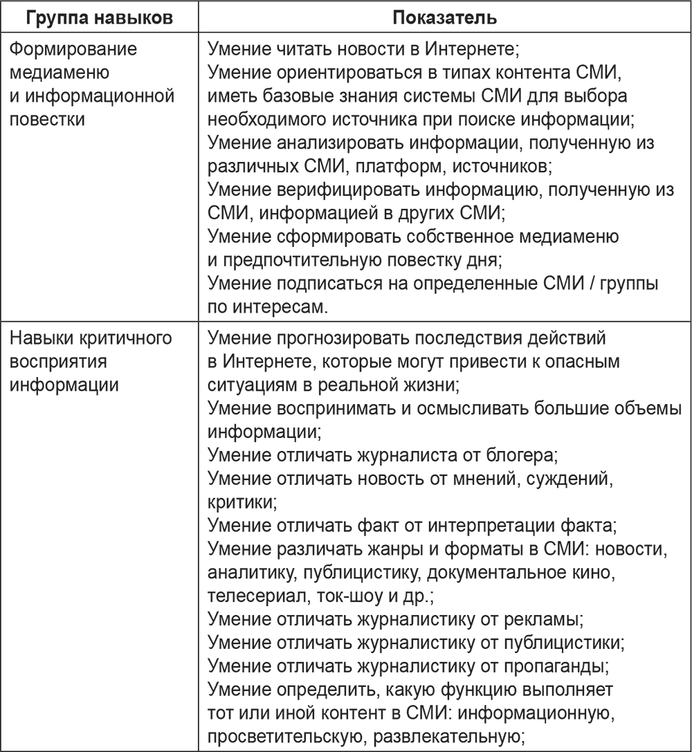 Таблица 2. Информационно-аналитические навыки, определяющие уровень медиаграмотности